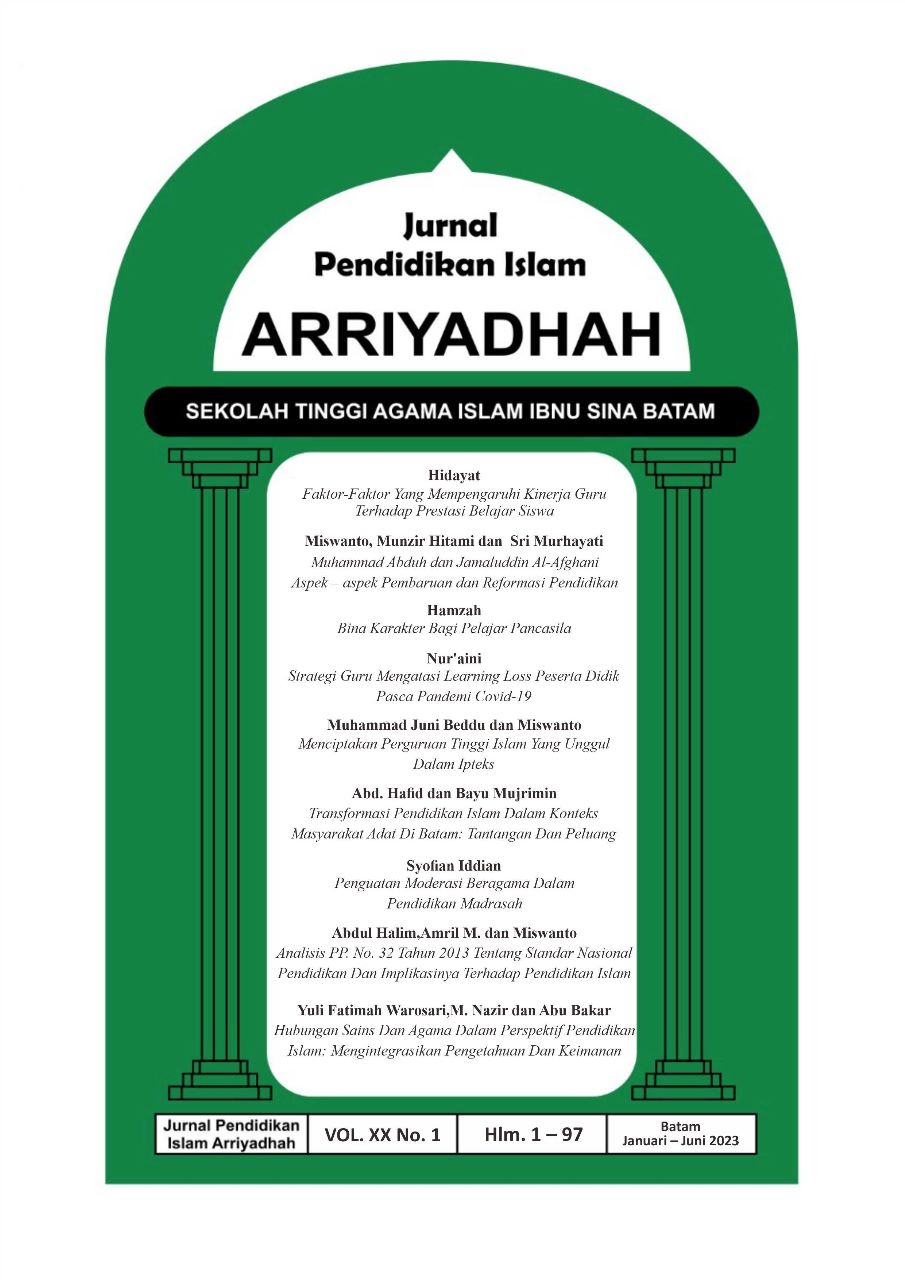 Vol. 20 No. 1 (2023)ARRIYADHAH (P-ISSN: 1979-5548) merupakan terbitan berkala yang diterbitkan oleh oleh Program Studi Pendidikan Agama Islam Sekolah Tinggi Agama Islam (STAI) Ibnu Sina Batam. Jurnal Arriyadhah mempublikasikan artikel hasil penelitian dan non penelitian yang dilakukan oleh peneliti, dosen, mahasiswa dan pemerhati pendidikan tentang Pendidikan Agama Islam. Jurnal Arriyadhah terbit 2 (dua) kali dalam setahun, yaitu pada bulan Juni dan Desember.